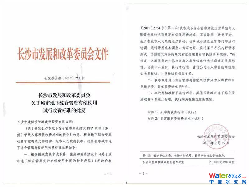 2017年7月,長沙市發(fā)改委就項(xiàng)目各管線入廊和日常維護(hù)的試行收費(fèi)標(biāo)準(zhǔn),進(jìn)行了書面批復(fù),該《收費(fèi)標(biāo)準(zhǔn)》已將八家權(quán)屬單位共計(jì)14類管線入廊費(fèi)和日常維護(hù)費(fèi)納入收費(fèi)范圍,為項(xiàng)目正式運(yùn)營收費(fèi)提供了保障。