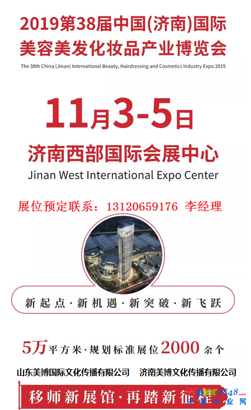 2019第38屆濟(jì)南國(guó)際美容美發(fā)化妝品產(chǎn)業(yè)博覽會(huì),時(shí)間:11月3-5日,地點(diǎn):濟(jì)南西部會(huì)展中心,主辦單位山東美博國(guó)際文化傳播有限公司作為中國(guó)美容美發(fā)化妝品行業(yè)的專業(yè)品牌打造商及綜合服務(wù)機(jī)構(gòu),專注于美業(yè)19年,提供多元化服務(wù),業(yè)務(wù)領(lǐng)域涵蓋:展會(huì)、會(huì)議、論壇、教育、新媒體等。展覽面積40000平方米,標(biāo)準(zhǔn)展位1500余個(gè)。匯聚1200多家國(guó)際國(guó)內(nèi)參展商.