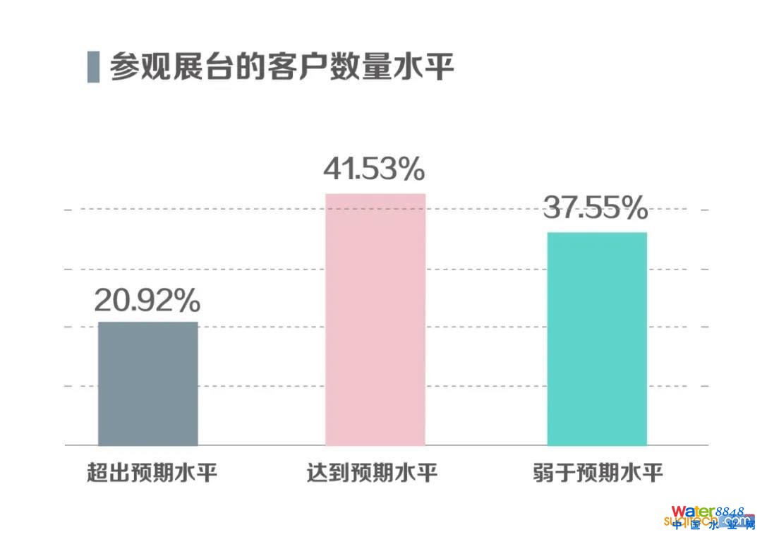 據(jù)統(tǒng)計,20.92%的展商朋友反饋展臺客戶數(shù)量水平超出預期水平,有41.53%比例的展商表示達到預期水平,37.55%的比例顯示弱于預期水平。