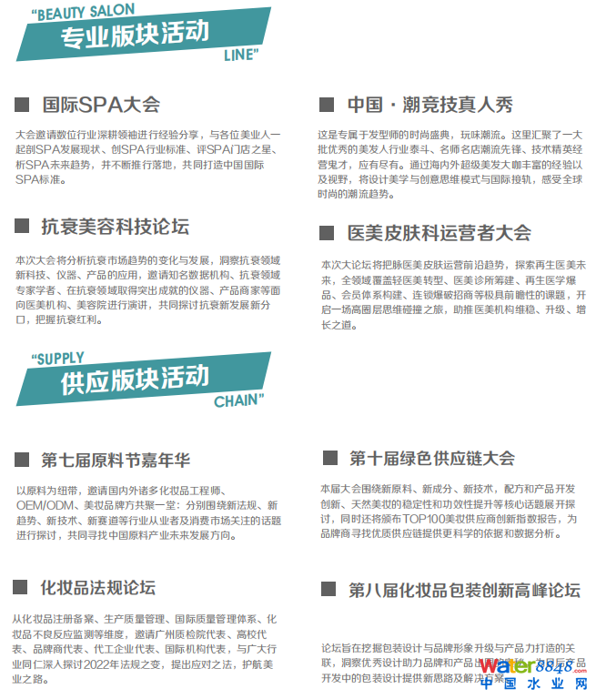 展期4天將舉辦超50場巔峰論壇和賽事活動,集結(jié)了數(shù)百位在業(yè)內(nèi)極具話語權(quán)的專家、精英、大咖,研討行業(yè)發(fā)展,分享跨界資訊,發(fā)布流行趨勢,為專業(yè)線、日化線、供應(yīng)鏈及綜合版塊全域賦能。
