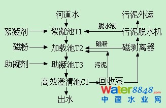 我公司提供給秦皇島市環(huán)保局的3個臺套的移動式污水處理車,處理能力分別為1000m3/d、3000m3/d、5000m3/d。移動式污水應急處理系統(tǒng)采用沉淀式磁分離水處理技術,通過模塊化組合集成到一個整體裝置中,并通過設備化可實現(xiàn)直接移動。 其主要包括磁分離加載混凝沉淀系統(tǒng),污泥回流與磁粉回收系統(tǒng),加藥配藥系統(tǒng),污泥脫水系統(tǒng)以及電控系統(tǒng)等幾個系統(tǒng)。 移動式磁分離應急處理集成裝置采用沉淀式磁分離水處理技術,其主要流程圖如下: 河道水經(jīng)提升泵進入到絮凝池T1,在絮凝池中通過投加絮凝劑進行絮凝反應和化學除磷反應,之后進入到加載池T2,在加載池中主要使絮體和磁粉進行充分混合并進行初步加載反應,混合均勻的水通過在T3反應池中投加高效助凝劑,完成最終的磁粉加載反應,完成反應的水體進入到高效澄清池中進行固液分離,上清液排放。澄清池中的污泥一部分通過回流直接回流至加載池,另一部分則通過磁粉回收泵進入到磁分離系統(tǒng)進行分離和磁粉回收,剩余污泥通過排放至污泥脫水機完成污泥的脫水,脫水液回至最初的絮凝池,而泥餅外運。 |