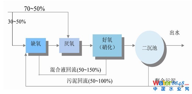 倒置A2/O工藝將缺氧池置于厭氧池前面,來自二沉池的回流污泥和30~50%的進水,50~150%的混合液回流均進入缺氧段,回流污泥和混合液在缺氧池內(nèi)進行反硝化,去除硝態(tài)氧,再進入?yún)捬醵,保證了厭氧池的厭氧狀態(tài),強化除磷效果,反硝化作用能夠得到有效保證。