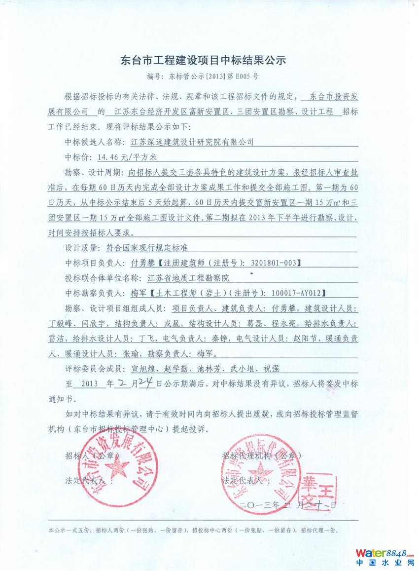 核心提示:江蘇東臺經(jīng)濟開發(fā)區(qū)富新安置區(qū)、三團(tuán)安置區(qū)勘察、設(shè)計工程 【信息時間: 2013/2/21 】