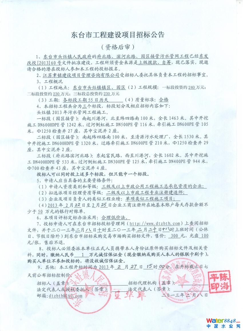 核心提示:東臺(tái)市頭灶鎮(zhèn)府北路、濱河北路、園區(qū)接管污水管網(wǎng)工程 【信息時(shí)間: 2013/2/8】【