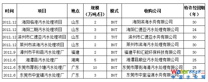 跨入2013年以來,北控水務(wù)先后簽訂了昆明第十一污水處理廠BT項目、北海鐵山港區(qū)5、6號排水明渠BT項目,并對南寧市大沙田供水有限責(zé)任公司進(jìn)行增資擴(kuò)股,針對成都市郫縣沱江河流域水環(huán)境綜合治理項目開展投資合作,簽約收購了持有吉林城市垃圾焚燒發(fā)電項目、污泥處理項目的吉林市雙嘉環(huán)保能源利用有限公司和持有東莞市7家污水處理廠的項目公司。其中,東莞收購項目中,北控水務(wù)是以5.041億元成功收購項目公司的全部股權(quán),7家污水處理廠合計污水處理能力57萬噸/日,項目特許經(jīng)營期為25年。