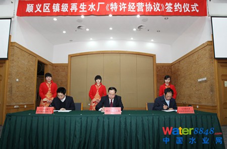2013年4月2日,北京市首批引進(jìn)社會(huì)資本再生水廠建設(shè)運(yùn)營(yíng)項(xiàng)目在順義簽約,順義區(qū)水務(wù)局與北京碧水源科技股份有限公司、碧水源久安公司簽訂了順義區(qū)鎮(zhèn)級(jí)再生水廠《特許經(jīng)營(yíng)協(xié)議》,特許經(jīng)營(yíng)期為25年!短卦S經(jīng)營(yíng)協(xié)議》的簽訂標(biāo)志著北京市首批引進(jìn)社會(huì)資本建設(shè)和運(yùn)營(yíng)的8座鎮(zhèn)中心區(qū)再生水廠項(xiàng)目進(jìn)入實(shí)施階段。北京市水務(wù)局局長(zhǎng)金樹(shù)東,順義區(qū)領(lǐng)導(dǎo)王剛、盧映川,碧水源董事長(zhǎng)文劍平、總經(jīng)理戴日成等出席簽約儀式。