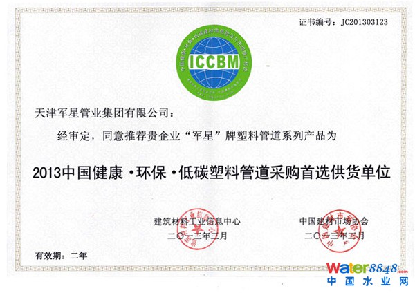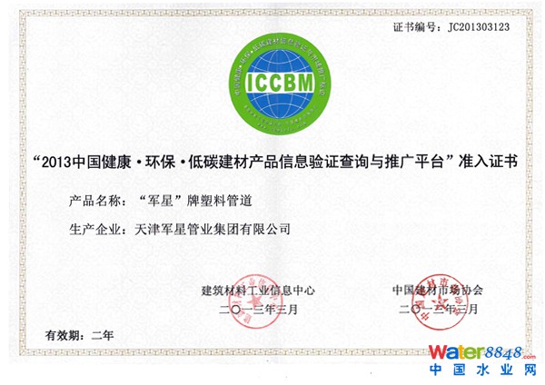 日前,經(jīng)中國(guó)建材市場(chǎng)協(xié)會(huì)、建筑材料工業(yè)信息中心專家組嚴(yán)格審核,我軍星管業(yè)集團(tuán)順利通過(guò)審核,獲得 “2013中國(guó)健康•環(huán)保•低碳建材產(chǎn)品信息驗(yàn)證查詢與推廣平臺(tái)”準(zhǔn)入證書(shū)和“2013中國(guó)健康•環(huán)保•低碳塑料管道采購(gòu)首選供貨單位”推廣證書(shū)。
