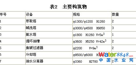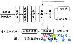 萃取后的含酚廢水由萃取塔排出,經(jīng)蒸氨脫除部分氨,再與其它廢水混合,進(jìn)入隔油池除油,然后經(jīng)過調(diào)節(jié)池調(diào)節(jié)水質(zhì)水量后,進(jìn)入生化處理流程。