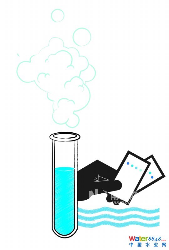 檢測PH值,試驗人員在兩份水樣中加入測試劑,然后通過水樣變化的顏色,與標(biāo)準(zhǔn)色進行對比,在試驗人員的桌上,裝著不同顏色的標(biāo)準(zhǔn)比色系列試管,水的顏色從紅色到藍色,分別代表從低到高的PH值,其中數(shù)值越低,表示水質(zhì)酸性越大,數(shù)值越高,水質(zhì)堿性越大。