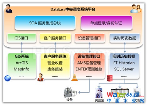 水務(wù)企業(yè)信息化建設(shè)的過程中容易形成數(shù)據(jù)孤島。DataEasy平臺遵循SOA設(shè)計規(guī)范,具有良好的擴展能力,可將生產(chǎn)實時歷史數(shù)據(jù)、實驗室數(shù)據(jù)、設(shè)備管理信息、地理信息、客戶服務(wù)信息等眾多相關(guān)數(shù)據(jù)整合到公司數(shù)據(jù)中心,形成多維的中央調(diào)度決策視圖。