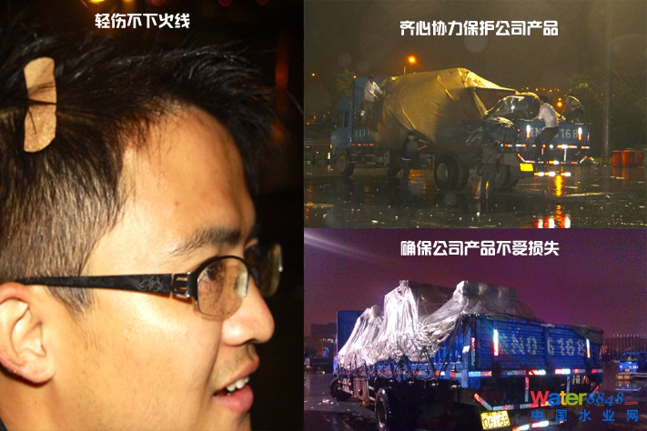 此次展會(huì)的最后一天(6月7日),上海大到暴雨,為了盡快將展品撤出展館,我司生產(chǎn)中心同事協(xié)助對(duì)展品打好包裝。其中一名同事不小心頭部受傷,只是簡(jiǎn)單的用創(chuàng)可貼貼上后又繼續(xù)工作,充分發(fā)揚(yáng)了輕傷不下火線的精神。展品裝上車后,為防止展品淋濕,我司所有參展人員協(xié)助司機(jī)師傅將展品蓋上防雨布,狂風(fēng)將防雨布吹得到處亂飛,我司人員紛紛爬上車,用身體將防雨布?jí)汉,確保公司展品的安全。