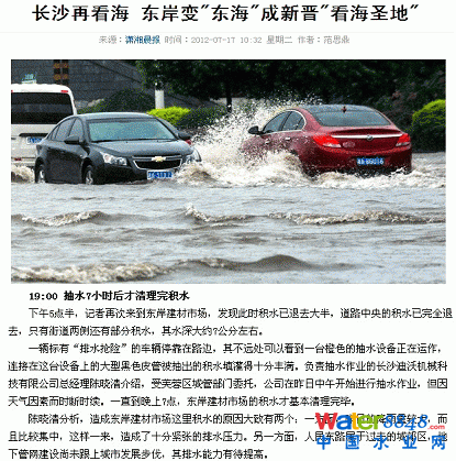 瀟湘晨報(bào)報(bào)道了人民東路東岸建材市場(chǎng)附近積水成“澤國(guó)”,迪沃現(xiàn)場(chǎng)緊急排水的新聞: