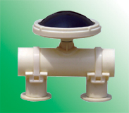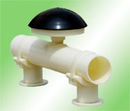 曝氣器采用球冠形結(jié)構(gòu),膜片采用斜穿切口式打孔技術(shù),其中心頂部有無(wú)孔區(qū),且內(nèi)設(shè)兩道環(huán)形止水線,因而具有良好的防堵塞、防倒灌性能。