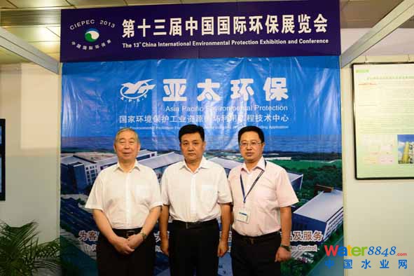 第十三屆中國國際環(huán)保展覽會2013年7月23日上午在北京開幕,國家環(huán)境保護部吳曉青副部長(中),在中國環(huán)境保護產業(yè)協會王心芳會長(左)的陪同下,到亞太環(huán)保展區(qū)視察指導,聽取了亞太環(huán)保曾子平董事長(右)的匯報。