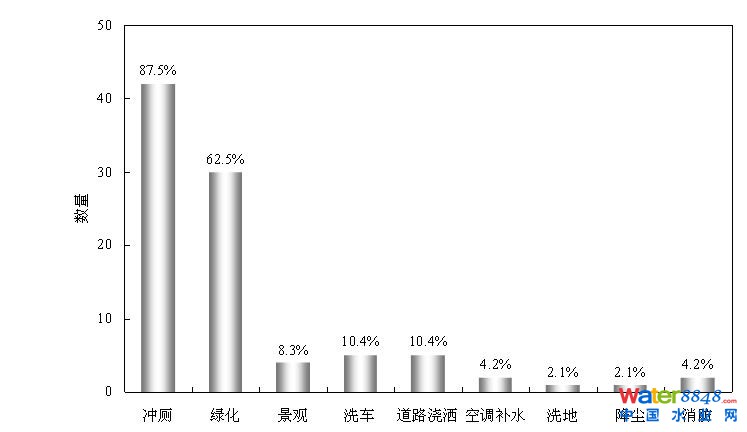 目前我國社區(qū)污水再生利用大多以沖廁和小區(qū)雜用為主。2004年8月~2005年3月,筆者對京津地區(qū)的48家社區(qū)污水再生利用狀況作了調(diào)研(其中商業(yè)樓宇、大專院校、居民小區(qū)各16家),其出水用途統(tǒng)計如圖1所示?梢娫谏鐓^(qū)污水再生利用中,沖廁和綠化占了相當大的比例。