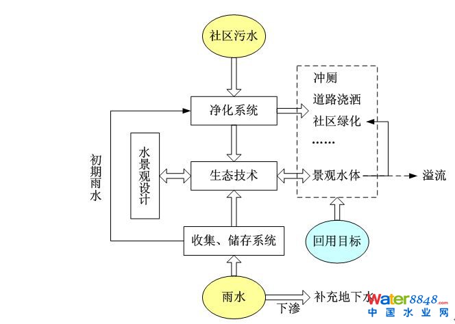 圖2 社區(qū)污水再生利用、雨水蓄用與水景觀建設(shè)綜合解決方略