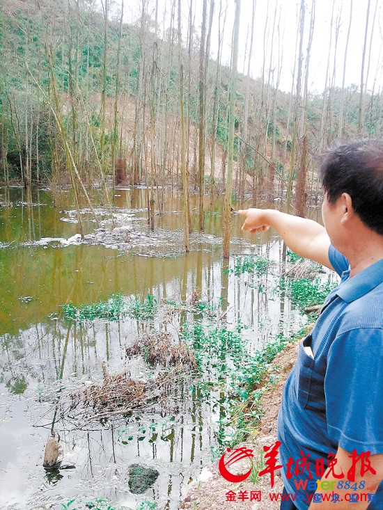 據(jù)村民介紹,被污染山坑大概5畝左右。記者看到,現(xiàn)場一片狼藉,墨綠色的污水橫流,不時(shí)看到浮在水面上一堆堆黑色的雜物和白色的塑料袋,山坑的桉樹泡在污水中,樹枝已經(jīng)枯掉倒在污泥中。只要一走近池塘就能聞到臭氣熏天的氣味,越往里走越嚴(yán)重。池塘被中間一道堤壩攔了起來,一分為二,堤壩下面污水還不停地冒著泡泡,污水流往山下,山下的綠化樹被污水浸泡過,樹葉漸漸枯黃。