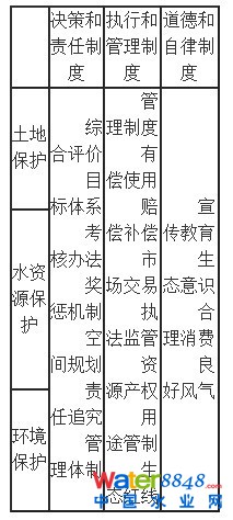 這3類(lèi)任務(wù)適用于耕地保護(hù)、水資源保護(hù)、環(huán)境保護(hù)等多個(gè)領(lǐng)域,由此,可以得到一個(gè)生態(tài)文明制度的矩陣(見(jiàn)下圖)。