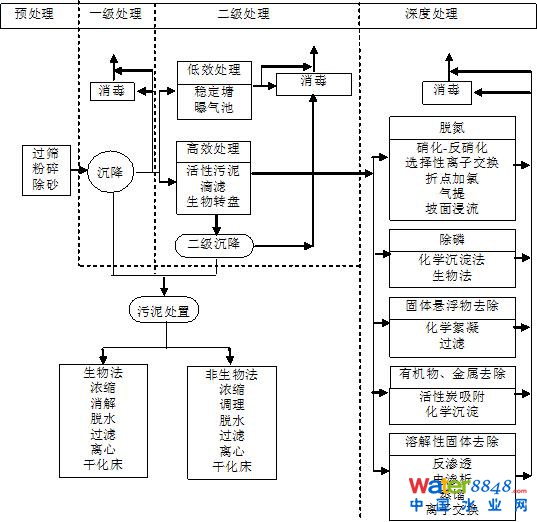 城市污水再生處理一般可分為預(yù)處理、一級處理、二級處理和深度處理(亦稱高級處理或三級處理)。處理流程如圖1(Pettygrove et al, 1985)所示。