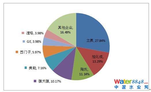 主要膜廠商市場(chǎng)占有率分析圖(按供水項(xiàng)目規(guī)模)