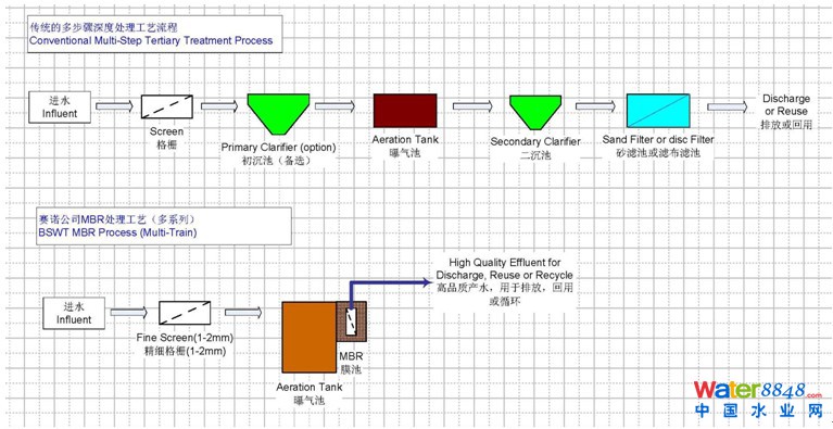 MBR是以酶、微生物、動植物細胞為催化劑,進行化學反應和生化轉(zhuǎn)化,同時憑借膜不斷進行泥水分離的生物反應技術。 它利用膜組件(UF或MF)替代傳統(tǒng)的二沉池+濾池,減小了生物池容積,克服了污泥流失的問題,使出水水質(zhì)更穩(wěn)定,有 較強的耐沖擊負荷能力。MBR工藝適用于市政污水和工業(yè)污水的直接處理,對于COD和TN有著出色的降解能力。MBR的 產(chǎn)水水質(zhì)可以達到反滲透預處理的要求,能夠直接進入反滲透系統(tǒng)。