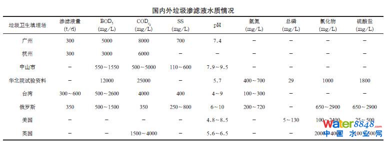 垃圾滲濾液中的CODcr一般達(dá)15000mg/L,BOD5 一般達(dá)6000mg/L;垃圾滲濾液中含有10多種金屬離子,且氮多以氨氮形式存在,約占TKN(總凱氏氮)的40%~50%。國內(nèi)外垃圾衛(wèi)生填埋滲濾液水質(zhì)情況見后表。