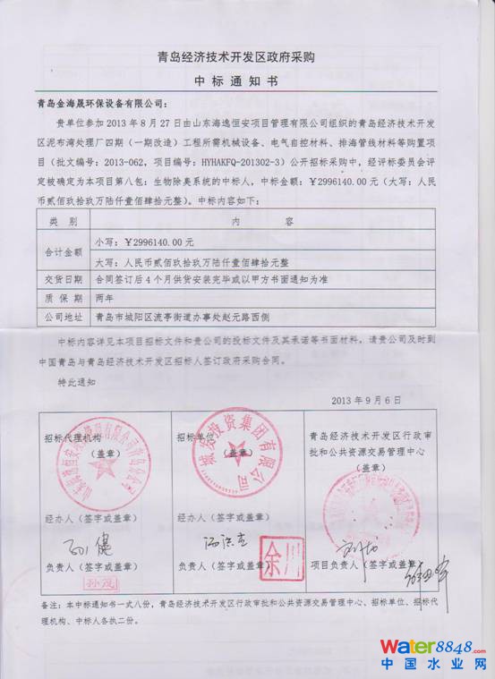 來自國(guó)內(nèi)的上海實(shí)力機(jī)電、常州天興環(huán)保、江蘇純江環(huán)保和青島金海晟等公司共同參與了該項(xiàng)目的投標(biāo)活動(dòng)。經(jīng)過專家小組的統(tǒng)一論證,我公司以優(yōu)良的設(shè)備、突出的特性、合理的價(jià)格、誠(chéng)懇的服務(wù),得到專家小組的一致好評(píng)。專家小組推薦我公司為第一候選人,并報(bào)經(jīng)市政府采購中心批準(zhǔn),確定青島金海晟環(huán)保公司為中標(biāo)人。