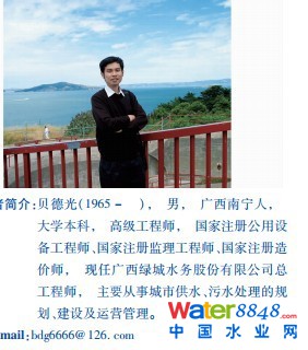 貝德光先生,1965 年 8 月出生,本科學(xué)歷,高級工程師,現(xiàn)任廣西綠城水務(wù)股份有限公司總工程師。曾先后擔(dān)任中國輕工總會南寧設(shè)計院給排水專業(yè)主任工程師,南寧市自來水公司副總工程師,南寧市南水供水設(shè)計有限責(zé)任公司副經(jīng)理,公司中心調(diào)度室主任、生產(chǎn)技術(shù)部部長。貝德光先生擁有全國注冊監(jiān)理工程師、全國注冊造價工程師和全國注冊公用設(shè)備工程師資格,并被聘為“全國給水排水技術(shù)信息網(wǎng)核心專家?guī)?rdquo;專家、中國城鎮(zhèn)供水排水協(xié)會供水專業(yè)委員會凈水技術(shù)工作部副部長、第八屆廣西給水排水學(xué)會委員、廣西供排水協(xié)會科技委副主任、中國土木工程學(xué)會水工業(yè)分會排水委委員、中國土木工程學(xué)會工業(yè)分會供水委委員。