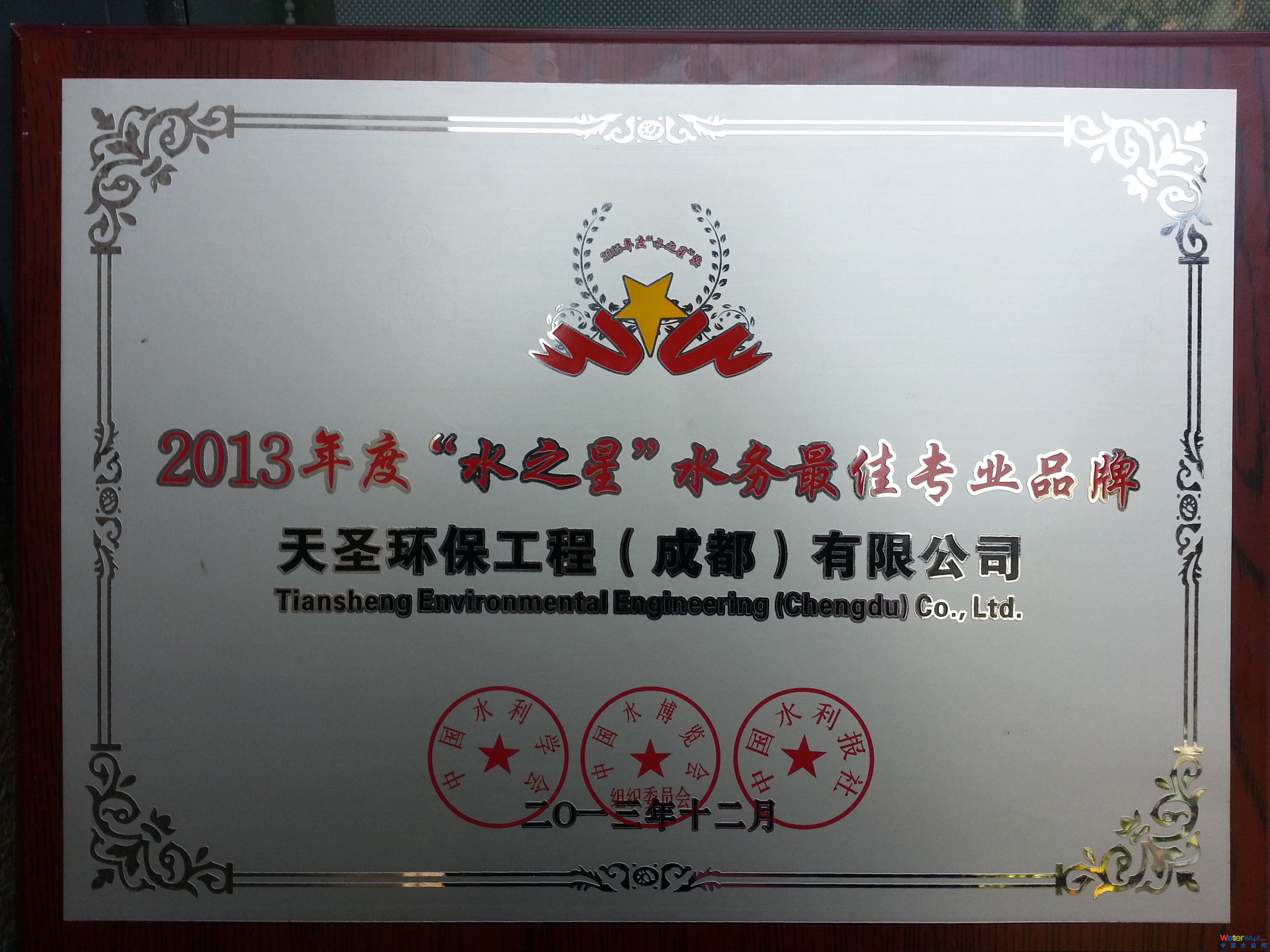天圣環(huán)保榮獲2013年度“水之星”水務(wù)最佳專(zhuān)業(yè)品牌獎(jiǎng) |