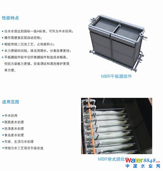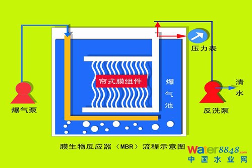 膜-生物反應(yīng)器(Membrane Bio-Reactor,簡(jiǎn)稱(chēng)MBR)是一種由膜分離技術(shù)與生物處理技術(shù)有機(jī)結(jié)合的新型態(tài)廢水處理系統(tǒng),取代傳統(tǒng)活性污泥系統(tǒng)中占地較大的二沉池,利用沉浸于好氧生物池內(nèi)之膜分離設(shè)備截留槽內(nèi)的活性污泥與大分子固體物,活性污泥(MLSS)濃度可達(dá)到10g/L以上,污泥齡(SRT)可延長(zhǎng)30天以上,如此高濃度系統(tǒng)大大降低了生物反應(yīng)池體積和建工作業(yè)量,產(chǎn)水水質(zhì)可達(dá)到國(guó)標(biāo)GB8978-1996污水綜合排放的一級(jí)A標(biāo)準(zhǔn),成為21世紀(jì)污水處理與水資源回收再利用的最優(yōu)選擇。