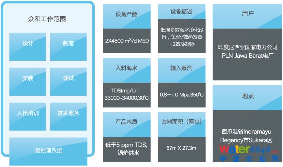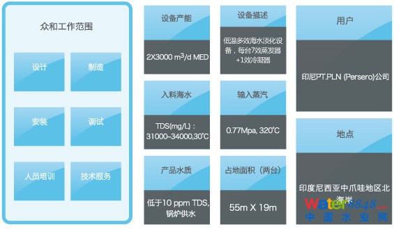 項目概況:2X315MW燃煤電廠位于印度尼西亞東爪哇地區(qū)南岸,離巴齊丹(Pacitan)往東約30Km。為促進(jìn)當(dāng)?shù)胤e極發(fā)展,解決用電問題,2007年新建巴齊丹2X315MW燃煤電廠,由于該地區(qū)嚴(yán)重缺水,電廠建設(shè)運(yùn)行所需用水均來自于眾和提供的2X3000m3/dMED海水淡化設(shè)備。