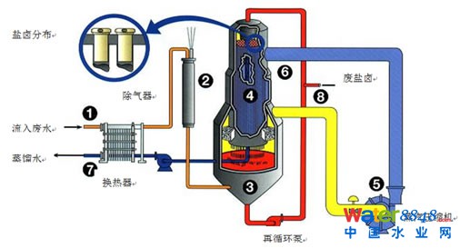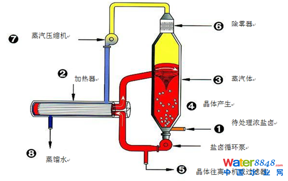 零排放技術(shù)利用蒸發(fā)方式從廢水中去除溶解性固體,并將蒸餾水經(jīng)過(guò)凈化和處理后可直接循環(huán)使用,不需要將水再排入河道或海洋。反滲透可用作預(yù)處理來(lái)濃縮廢水,濃縮后剩余水量需要蒸發(fā),大多數(shù)情況下,機(jī)械蒸汽在壓縮蒸發(fā)器在結(jié)晶前用作進(jìn)一步濃縮鹽水,循環(huán)后冷凝水可回用于工廠工藝段,實(shí)現(xiàn)廢水零排放。固體回用于工業(yè)原料和填埋。