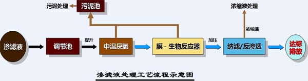 滲濾液經(jīng)過(guò)調(diào)節(jié)池調(diào)節(jié)水質(zhì)水量后,由提升泵提升,先經(jīng)過(guò)換熱器升溫,進(jìn)入?yún)捬醴磻?yīng)器,經(jīng)過(guò)厭氧微生物的 充分作用,把可生化的高濃度有機(jī)污染物盡最大可能利用厭氧生物消化,最終分解為沼氣、二氧化碳、水、氨 氮及未被完全消化利用的中間產(chǎn)物和難降解有機(jī)物,隨水流流到缺氧反應(yīng)器。在缺氧反應(yīng)器,與回流水完全混 合,兼氧微生物分解利用厭氧中未被完全降解的有機(jī)物中間產(chǎn)物。在此過(guò)程中,兼氧微生物將利用硝酸鹽及亞 硝酸鹽作為氧原降解有機(jī)污染物,同時(shí)使硝酸鹽轉(zhuǎn)化為氮?dú)猓绯鏊w,使水中總氮含量得以降低,同時(shí)產(chǎn)生 堿度,使MBR好氧池中硝化作用所需堿度條件更有保障。經(jīng)過(guò)反應(yīng)后進(jìn)入MBR好氧反應(yīng)池,利用好氧微生物的作 用,使殘余的可被生物降解的有機(jī)物進(jìn)一步分解去除,使氨氮在硝化細(xì)菌的作用下,形成硝酸鹽,使水中氨氮 含量得以控制。不能生物降解的有機(jī)污染物在抽吸泵的作用下,隨水流進(jìn)入中間水池。然后進(jìn)一步由反滲透系 統(tǒng)處理,出水達(dá)標(biāo)排放,反滲透濃水和MBR、厭氧等產(chǎn)生的污泥均經(jīng)污泥存儲(chǔ)池回灌至垃圾填埋場(chǎng)。 根據(jù)每個(gè)滲濾液處理工程的特殊情況和要求、以及現(xiàn)場(chǎng)條件,應(yīng)在上述工藝的基礎(chǔ)上做進(jìn)一步的優(yōu)化設(shè)計(jì)和調(diào) 整,以更好地滿足達(dá)標(biāo)的要求和業(yè)主及用戶的需要。