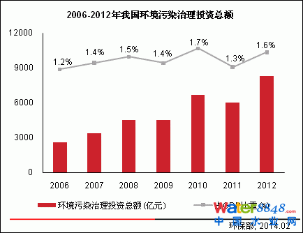 環(huán)保政策的密集出臺進一步推動了我國環(huán)境污染治理投資總額的攀升,2006-2010年,我國環(huán)境污染治理投資總額呈逐年增加趨勢,經過2011年的小幅回落之后,2012年大幅增長。2012年,全國環(huán)境污染治理投資為8253.6億元,占當年國內生產總值(GDP)的1.6%(見圖4)。