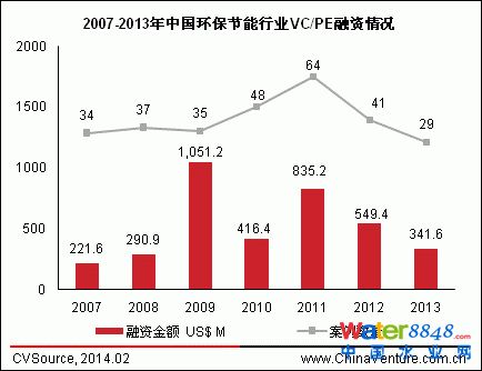 2007-2009年,環(huán)保節(jié)能行業(yè)融資金額逐年增長,2009年達到10.51億美元的歷史高點。經過2010年小幅回調后,2011年度受鼎暉2.58億美元收購新達科技、KKR1.14億美元投資聯合環(huán)境兩起融資案例拉動,環(huán)保節(jié)能行業(yè)融資再度活躍。2012-2013年,在VC/PE行業(yè)整體低迷的大環(huán)境下,環(huán)保節(jié)能行業(yè)投資案例數量和規(guī)模連續(xù)兩年下滑,根據投中研究院統計顯示,2013年我國環(huán)保節(jié)能行業(yè)共披露融資案例29起,融資總額為3.42億美元,數量和金額同比分別下降29.3%以及37.8%,創(chuàng)下近五年新低(見圖1)。