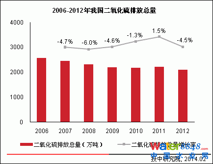 二氧化硫是主要大氣污染物之一,作為二氧化硫排放大戶的火電市場是大氣污染治理的重點。過去十年,受國家政策扶持及減排力度加強等因素影響,脫硫行業(yè)發(fā)展迅猛,先后經過供不應求的爆發(fā)性增長、供大于求的階段性洗牌后逐漸回歸理性,進入供需平衡的成熟階段。2006-2012年間,我國脫硫行業(yè)發(fā)展成效顯著,全國廢氣中二氧化硫排放量總體呈現下降趨勢。2012年,全國二氧化硫排放量2117.6萬噸,比上年減少4.5%(見圖8)。