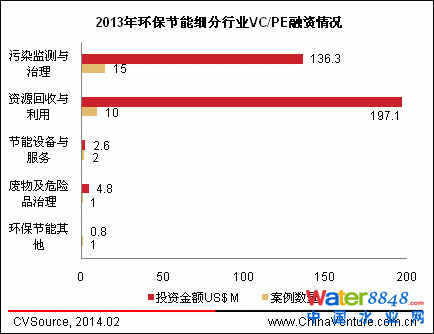 圖2 2013年環(huán)保節(jié)能細分行業(yè)VC/PE融資情況