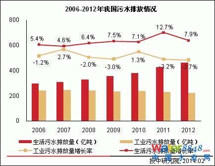 隨著工業(yè)化、城市化進程的加速以及人口的不斷增長,污水排放總量呈持續(xù)上升趨勢。2012年,我國污水排放總量為684.8億噸,比上年增加3.9%。其中,工業(yè)污水排放量221.6億噸,比上年減少3.7%,占污水排放總量的32.3%;生活污水排放量462.7億噸,比上年增加7.9%,占廢水排放總量的67.6%。總體來看,2006-2012年,我國工業(yè)污水排放量總體上穩(wěn)中有降,但隨著人口的增長,生活污水排放量逐年增加(見圖5)。