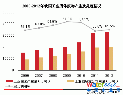 工業(yè)固體廢物作為固體廢棄物的一種,指在工業(yè)生產活動中產生的固體廢物,包括工業(yè)生產過程中排入環(huán)境的各種廢渣、粉塵及其他廢物。隨著社會的發(fā)展和工業(yè)化進程的加速,我國工業(yè)固體廢物產生量逐年增加。2012年,全國工業(yè)固廢產生量為32.9億噸,同比增加1.96%。同時,隨著工業(yè)固廢處理行業(yè)的發(fā)展,我國工業(yè)固廢綜合利用量也逐年增加。2012 年,工業(yè)固廢綜合利用量達20.2億噸,同比增長3.71%,綜合利用率達61.5%(見圖1)。