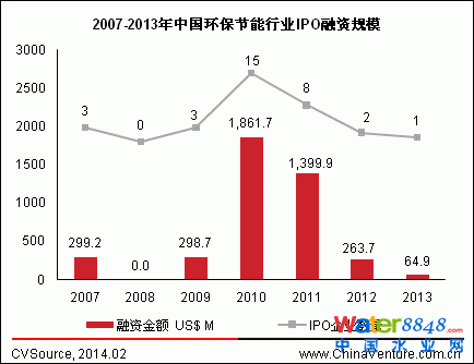 資本市場方面,環(huán)保行業(yè)企業(yè)IPO冰封一年多之后,于2013年三季度艱難重啟。9月25日,中滔環(huán)保(01363.HK)成功在港交所主板上市,發(fā)行股票3.4億股,累計募集資金5.03億港元,成為2013年度環(huán)保行業(yè)唯一的一起IPO案例(見圖3)。中滔環(huán)保集團有限公司是一家污水處理及工業(yè)供水服務的企業(yè),主要服務涵蓋污水處理及工業(yè)供水服務行業(yè)的整個價值鏈,包括污水處理及供水設施的設計、規(guī)劃、采購、建設營運及維護等。