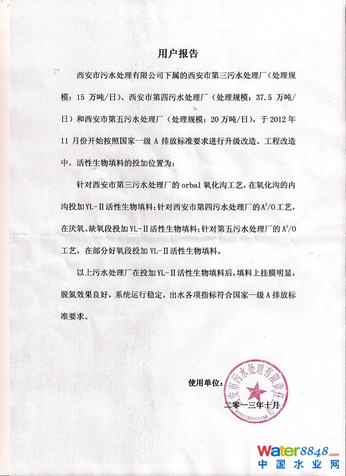 核心提示:YL活性生物填料再受肯定  西安市污水處理有限責(zé)任公司下屬第三、第四、第五,三個污水廠于2013年進行升級改造,投加使用江蘇裕