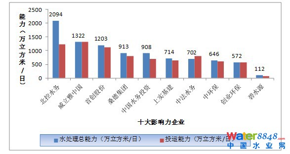 2013年,十大影響力企業(yè)新簽約項(xiàng)目規(guī)模1206萬立方米/日 北控水務(wù)占比50%以上