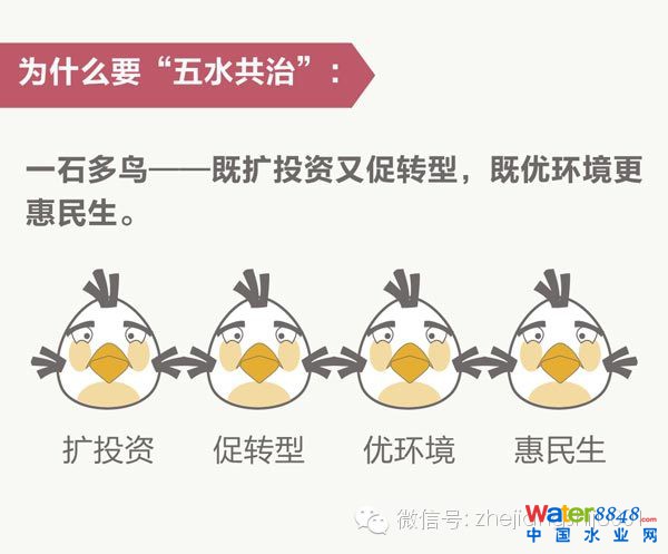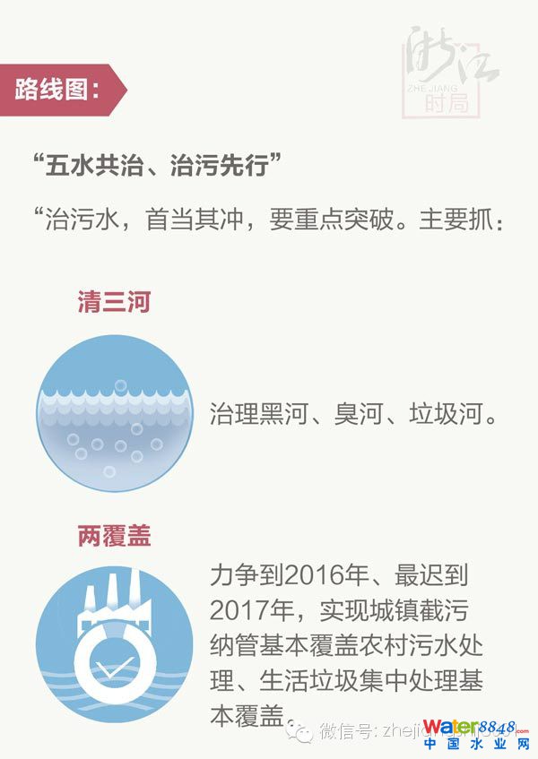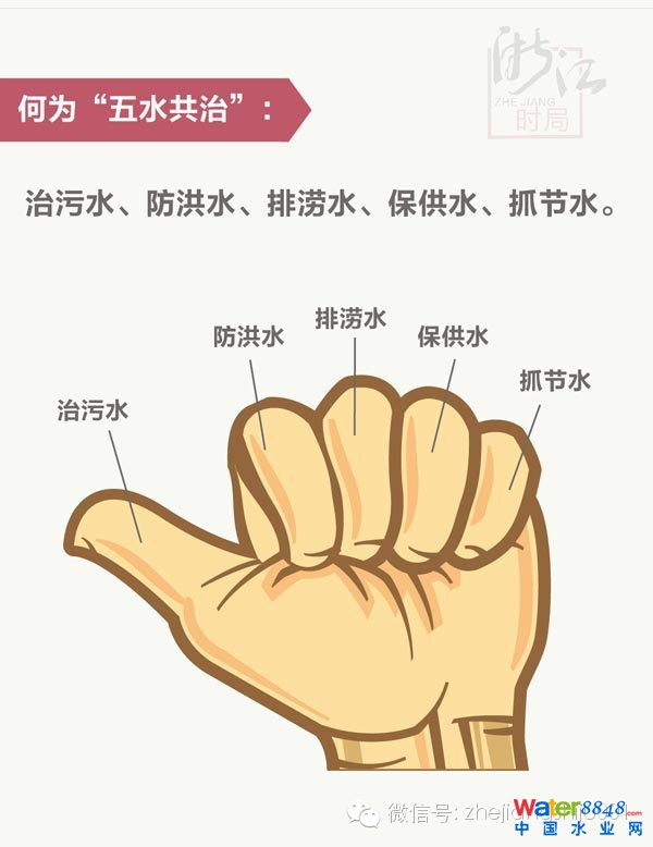 五水共治,好比五個(gè)手指,治污水是大拇指,防洪水、排澇水、保供水、抓節(jié)水是其他四指,分工有別,和而不同,捏起來(lái)就是一個(gè)拳頭。治污水的大拇指最粗,百姓觀感最直接,也最能帶動(dòng)全局,最能見(jiàn)效。治好污水,百姓必會(huì)豎起大拇指。為此,省委省政府特地繪出了浙江“五水共治,治污先行”的路線路——