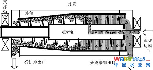 (1)沉降式離心機:如圖1所示,在一個旋轉(zhuǎn)的圓簡形容器中,泥漿中固體顆粒將受到比重力大很多倍離心力的作用,使得比液體密度大的固體顆粒沿半徑向旋轉(zhuǎn)的四壁移動沉積,如四壁是開孔的或是可滲透的,液體穿過沉積的固體顆粒和四壁而排出,從而達到固液分離的目的。淤泥經(jīng)脫水以后含水率在(1.0~1.2)wL左右。日本采用的沉降式離心機每小時處理100m3,有的場合可以少用藥劑或者不用藥劑,轉(zhuǎn)速3000r/min左右。
