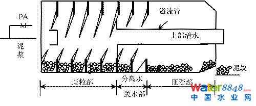 (2)水中造粒機:如圖2所示,泥漿和藥劑混合后形成疏散絮體,在造粒機和重力作用下,讓其沿曲面滾動、碰撞、移位、產(chǎn)生剪切力,受到各種不均勻的作用,迫使水分從疏散的絮體中分離出來,使絮凝物如滾雪球一樣,逐漸加大,成為密實體,形成年輪結(jié)構(gòu),從而完成泥水分離。淤泥經(jīng)脫水以后含水率在(0.7~0.8)wL左右。日本、美國采用的水中造粒機每小時處理30m3,電耗在各類脫水機中最低,轉(zhuǎn)速1~2r/min。