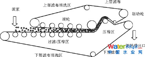 (4)帶式壓濾機:如圖4所示,利用濾布的張力和壓力在濾布上對添加過藥劑的淤泥施加壓力使其脫水。淤泥經(jīng)脫水以后含水率在1.0wL左右。瑞典采用的2.6m寬的帶式壓濾機每小時處理60m3,日產(chǎn)泥餅264t。