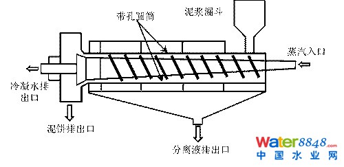 (3)螺桿式壓濾機:如圖3所示,泥漿和藥劑混合后形成疏散絮體,將其送入料斗后受到螺旋葉片的推送而向濾渣出口移動。由于螺桿外徑越向出口越大,所以它同帶孔圓筒之間的間隙越來越小。這樣,泥漿在逐漸增大的壓榨力下脫水,其中水分從筒體的濾網(wǎng)孔流出,而泥渣則從卸料口排出。淤泥經(jīng)脫水以后含水率在(0.6~0.8)wL左右。日本、德國采用的螺桿式壓濾機每小時處理20m3,轉(zhuǎn)速3~5r/min。