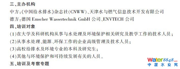 為進(jìn)一步推動(dòng)中德在高新技術(shù)的引進(jìn)以及運(yùn)行管理經(jīng)驗(yàn)的交流分享等層面的合作,通過考察德國的城市污水處理運(yùn)行管理模式,進(jìn)一步優(yōu)化國內(nèi)已有的污水處理技術(shù),降低城市污水處理設(shè)施的運(yùn)行費(fèi)用,能夠?yàn)槲覈鞘形鬯幚淼某掷m(xù)運(yùn)行提供有價(jià)值的管理經(jīng)驗(yàn)。為此,中國給水排水雜志社與全球久負(fù)盛名、德國最大的并已有100多年歷史的EMSCHER(埃姆歇)水協(xié)下屬埃姆歇水技術(shù)集團(tuán)公司建立了長期的培訓(xùn)合作關(guān)系,并將于2015年8月組織 赴德考察培訓(xùn)。