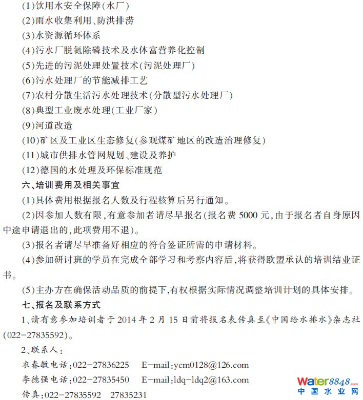 1、請(qǐng)有意參加培訓(xùn)者于2014年2月15日前將報(bào)名表傳真至《中國給水排水》雜志社(022-27835592)。