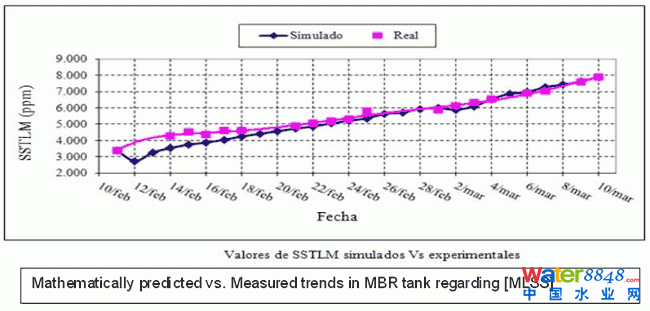 Figure 7: Mathematically predicted versus measured trends in MBR tank regarding [MLSS]